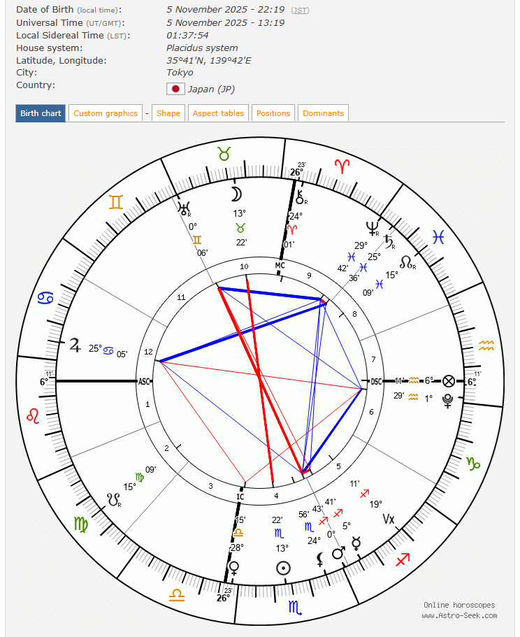 東京では、2025年11月5日、午後22時19分に、満月を迎えます。新月が午後21時25分だったので、新月図のハウスや感受点の位置から、それほど大きく動いていません。新月図では、MCにホロスコープの主役であった、海王星と土星がのっていたことに比べて、今回の満月図では、冥王星がディセンダントの近くにいることが、最大の大きな変化です。国内の政治的な変化が最大のイベントであった新月図から、問題の焦点が外交面に移っていくのが、この満月以降の流れになりそうです。ディセンダントは、敵国という意味もあるので、冥王星の力によって、極端な牽制球を投げつけないように、注意する必要はあるでしょう。