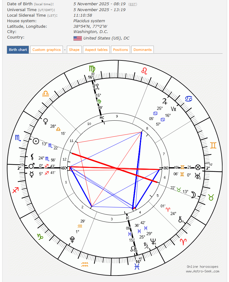 続いて、アメリカの満月図をみます。アメリカの首都、ワシントンDCでは、11月5日、午前8時19分に、満月を迎えます。アセンダントに火星が接近して、その火星と8ハウスの木星、2ハウスの冥王星と、協力的な角度をとっています。さらに、冥王星と木星の中間には、金星がいて、金星は11ハウスに位置しています。