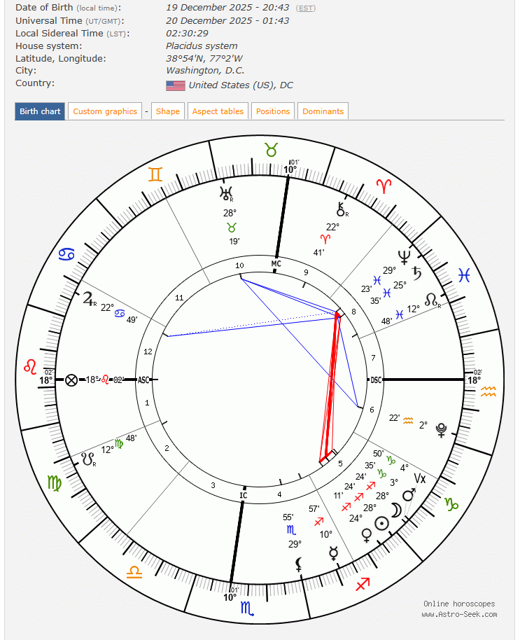 アメリカの首都、ワシントンDCでは、12月19日、午後20時43分に新月を迎えます。天体の主役ともいえる海王星と土星は8ハウス、太陽、月、金星は5ハウスです。8ハウスは経済市場を表す場所なので、年末から年明けにかけて、市場はかなりあれそうです。12月は、アメリカの消費活動がもっとも活発になるときでもあるので、今年はちょっと違うかな、というような実態が明らかになり、楽観主義的な雰囲気に、水をさすようになるかもしれません。