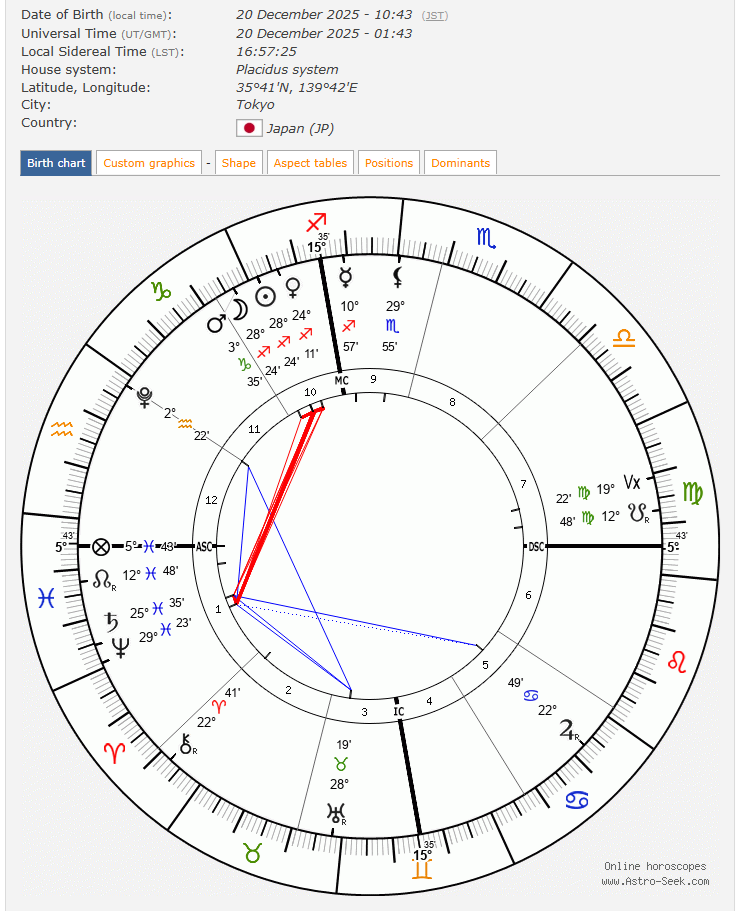 続いて、アメリカの新月図をみます。12月5日の満月図では、海王星と土星は10ハウス、冥王星が8ハウスにいました。物価高に悲鳴をあげる人が増えていく中で、トランプ大統領の人気にも陰りがでてきたようです。トランプ関税を無効にしようとして、最高裁に訴える大企業がでてきたりして、トランプ政権にとっても課題が山積みのようにみえます。株式市場は今のところ、大きく崩れているわけではないですが、金と銀の価格も大きく暴騰したり、インフラが進んでいる一方で、利息は下落傾向、今までの常識が通用しないような状況で、混沌としています。
