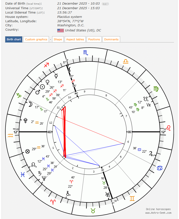 続いて、アメリカの冬至図をみます。アメリカの首都ワシントンDCでは、2025年12月21日、午前10時3分に、冬至を迎えます。6ハウスにある木星を除いて、全ての天体が左半分に収まっている、冬至図になります。