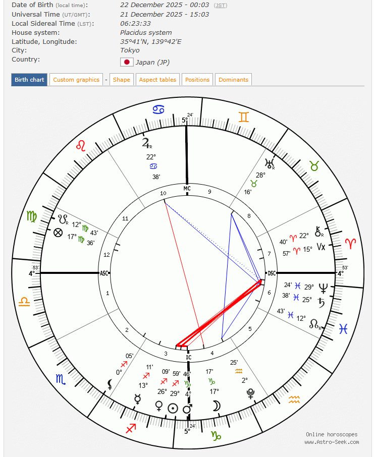 2025年12月22日は冬至です。冬至は一年のうちで、最も昼間の時間が短い時であり、太陽の力が最も弱まる日です。占星術では、太陽が山羊座に入室するタイミングで、その瞬間のホロスコープが冬至図です。