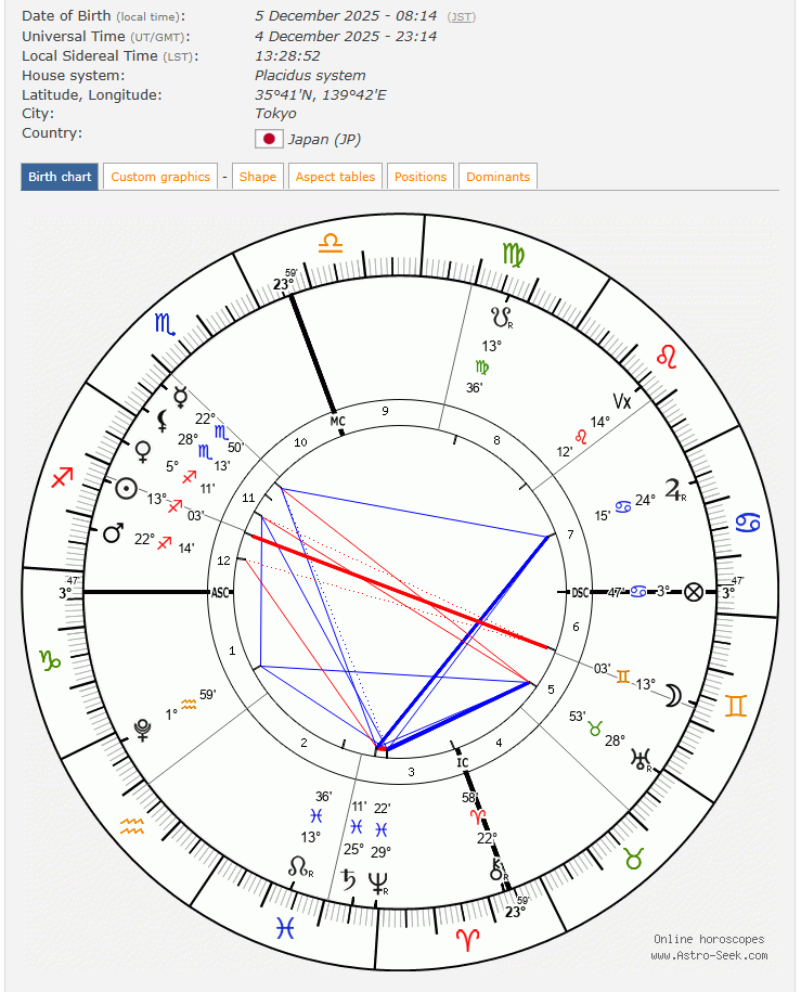 11月20日の日本の新月図では、7ハウスの蠍座に多くの天体が集まっていました。7ハウスは、同盟国や敵国との関係をあらわす場所で、外交をあらわす場所です。高市さんの発言に国際的な注目が集まり、とくに中国との関係が懸念されたことが目立ちました。MCの上に冥王星がいて、ICの木星がのっていて、水瓶座の冥王星が、蟹座の木星と対立していました。国の利益を守ろうとする木星と、博愛、穏和を大義名分とする冥王星が対立し、大きな選択をせまられるような新月図でした。