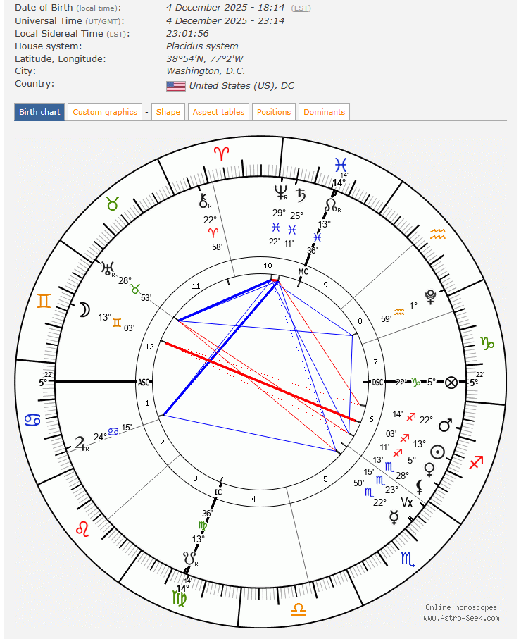 続いて、アメリカの満月図をみます。アメリカの首都ワシントンDCでは、12月4日、夕方18時14分に、満月を迎えます。11月20日のアメリカの新月図では、ディセンダントの上に土星と海王星がありましたが、新月図では、土星と海王星が、MCの近くに配置されています。ディセンダントは、交渉相手をあらわしますが、新月期間中は、米国が仲介していた、ロシアとウクライナの和平交渉が注目を集めました。