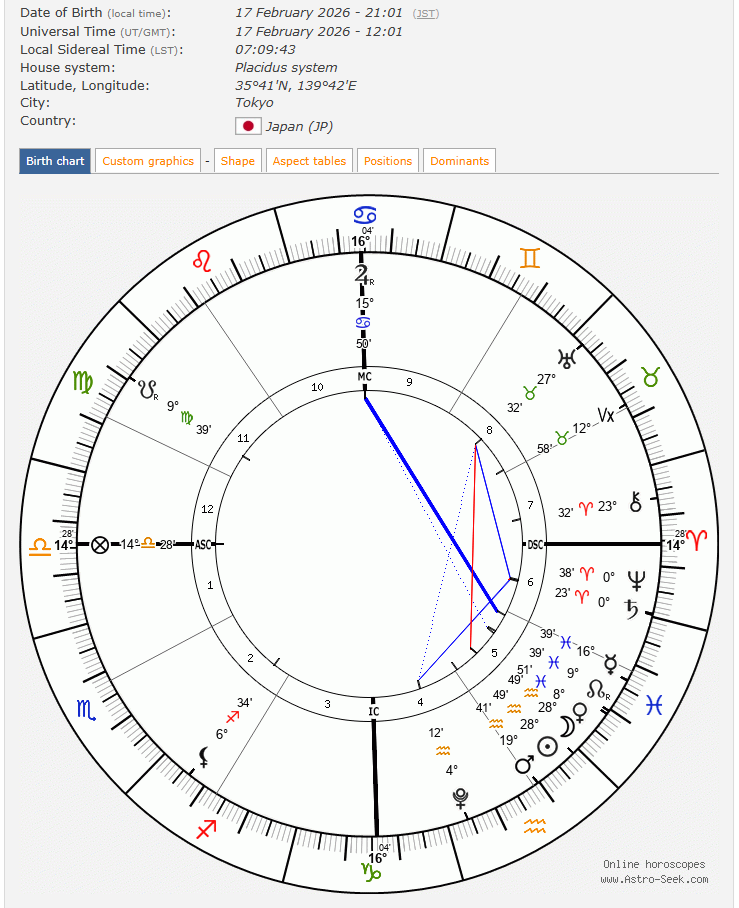 日本の首都、東京では、2月17日、夜21時2分に新月を迎えます。新月図では、水瓶座の太陽、月、火星、そして魚座の金星が5ハウスです。現在開催中のオリンピックは、このまま順調に、多くの日本人選手の活躍が期待できそうです。