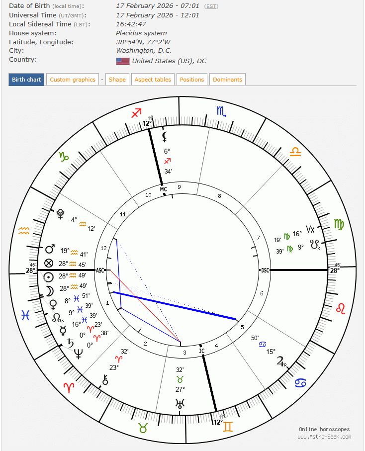 アメリカの首都、ワシントンDCでは、2月17日、午前7時1分に新月を迎えます。7ハウスに集中していた星たちは、1ハウスに移動して、この新月期間は、自国の問題に、正面をみすえて、取り組まざるを得ない状況になるでしょう。