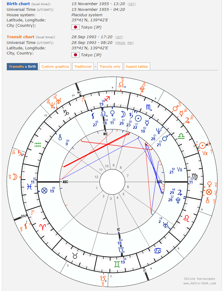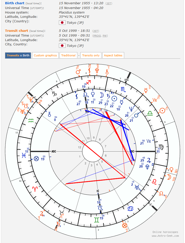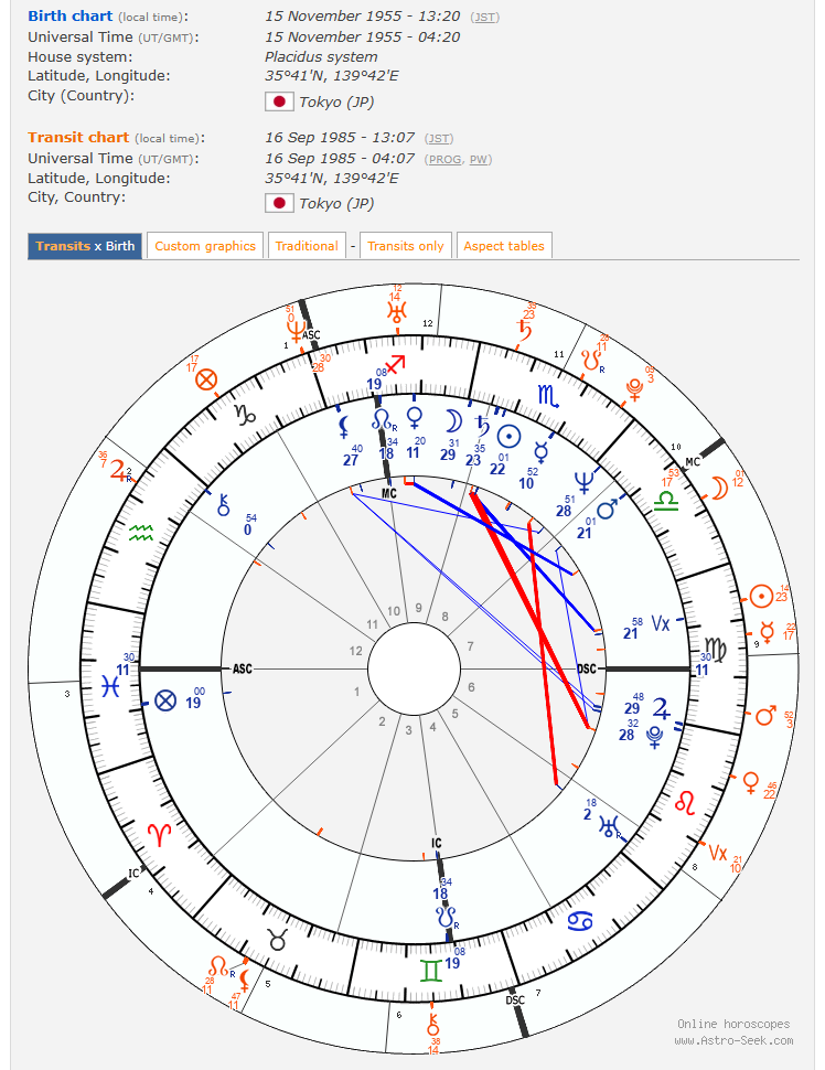 最後の土星回帰のタイミングであった、1985年9月16日の経過図の配置をみてみます。経過図の冥王星が、出生図の天王星に対して、緊張の角度をとっているのが、目立ちます。この年は、8月12日に、日本航空123便の墜落事故がありました。天王星は飛行機など事故や予期せぬ出来事をあらわし、冥王星は破壊と再生をあらわす星です。当時の中曽根首相は、事故の深層は墓場までもっていくと、語られていたことは有名ですが、この事故は、日本の政治の大きな転換期になったとも言われています。