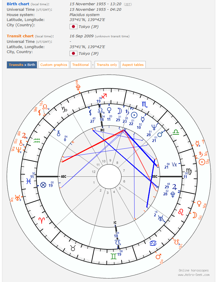 続いて、自民党の麻生内閣は総辞職し、自民党が再び野党に転じた、2009年9月16日の配置をみてみます。ここでも破壊と再生の星、冥王星が目立ちます。しかし、少し意外ですが、ポジティブな角度が多く、経過図の冥王星が、出生図の海王星、冥王星、木星と協力的な角度です。経過図の太陽、土星も、出生図の太陽と土星に対して協力的です。自民党が生まれ変わるために、冥王星と土星による、ポジティブな制裁といったところでしょう。