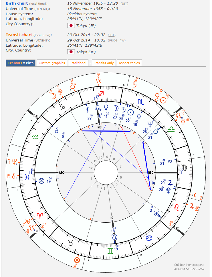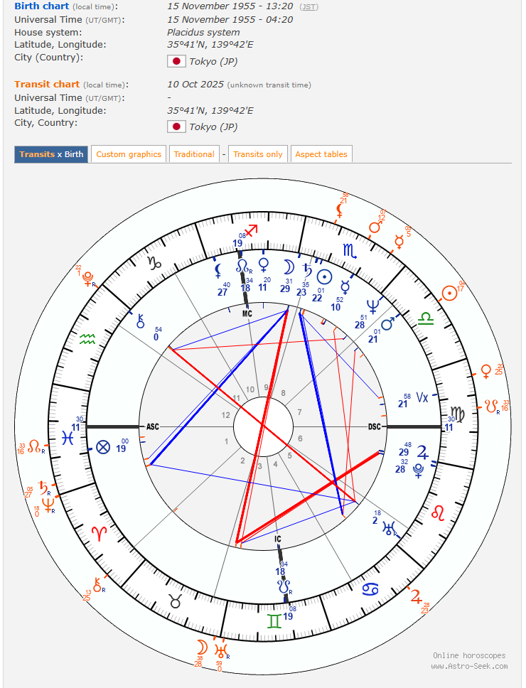 そして、最後にみるのは、10月10日、突然自民党が公明党から離脱宣言を言い渡されて、自公連立政権が、白紙の状態に戻ったときの星の配置です。経過図の冥王星が出生図の天王星の反対側にあり、経過図の天王星は、出生図の月の反対側で、出生図の冥王星と木星に対しても、緊張の角度です。予期せぬ出来事をあらわす天王星が目立った配置になっていることがわかります。突然の連立離脱は、自民党にとっても想定外の出来事だったといってよいでしょう。