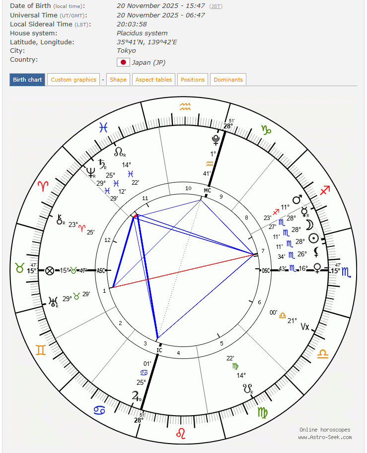 日本の首都東京では、11月20日、午後15時47分に新月を迎えます。水星座のグランドクロスと、クレイドルとよばれる台形の複合アスペクトが描かれている、とても調和にあふれたダイナミックな星の配置です。