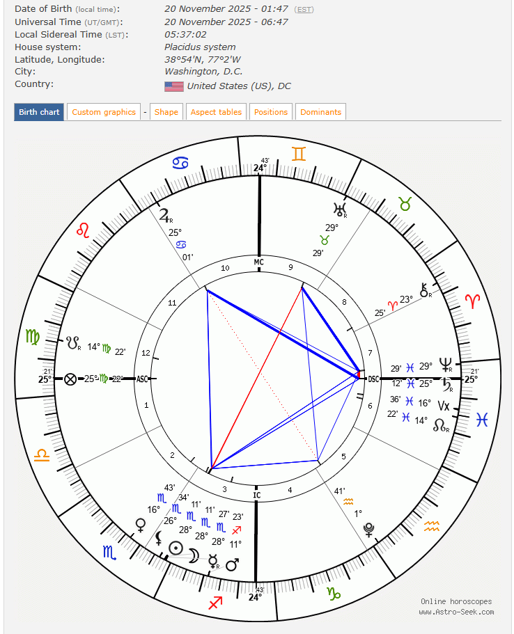 アメリカの首都、ワシントンDCでは11月20日の深夜、1時47分に新月を迎えます。ディセンダントの上に土星がのり、華々しい星の配置にもかかわらず、なんだか重苦しい雰囲気です。ディセンダントは敵国や、交渉相手などを意味します。中国やインドなど、影響力の大きな国との関税交渉は、大分片付いたようにみえますが、関税以外の事柄についても、さらなる摩擦の火種が浮上、まだまだ重要な交渉事項が続きそうです。と言うよりも、関税問題に決着がついてしまったら、トランプ大統領にとっては武器がなくなってしますので、敢えて、長引かせたいのでは?と、疑ってしまいます。