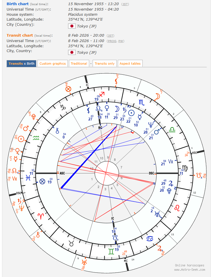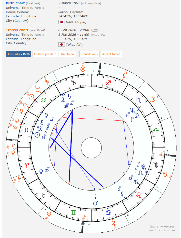さらに、経過図の木星は、出生図の太陽に対して、非常に友好的です。木星は、自民党に対しては、冷静沈着な感じでしたが、高市氏に対しては、とても協力的な仕事をしてくれています。自民党内においても、高市氏に対して、友好的な人とそうでない人がいるでしょうが、今回の選挙は、高石氏の見方を増やしてくれそうな感じです。