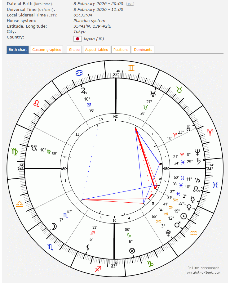 2026年2月8日に行われる、衆院解散後の総選挙を占います。突然の衆院解散で、事前の情報もほとんどなく、少々驚いています。1月19日の新月図から、この新月期間中の総選挙はないのでないか、と思っていたのですが、予期しない方向に動いたという感じです。この新月図は、本来でしたら、国政選挙でもりあがるような星の配置ではないのですが、そんな状況で中での、選挙がどうなるかは、興味深いところです。
