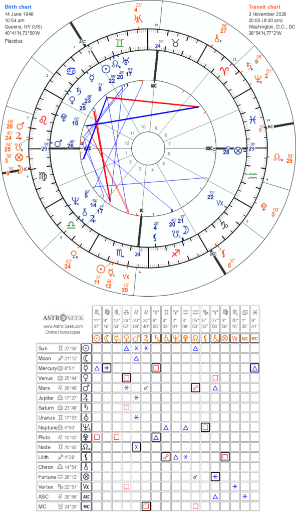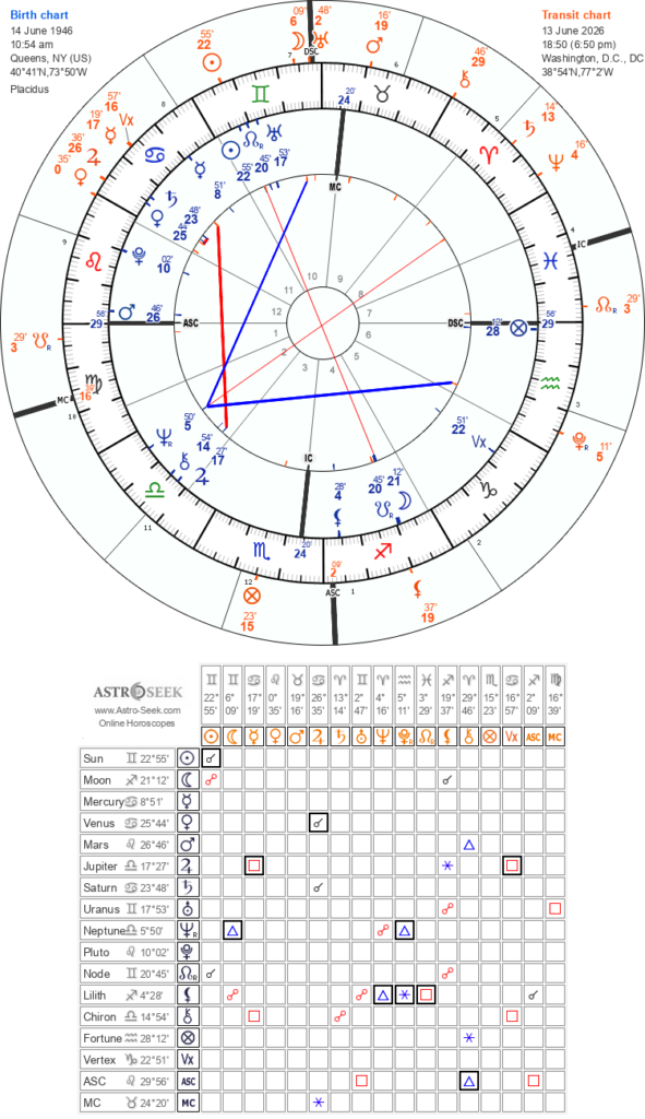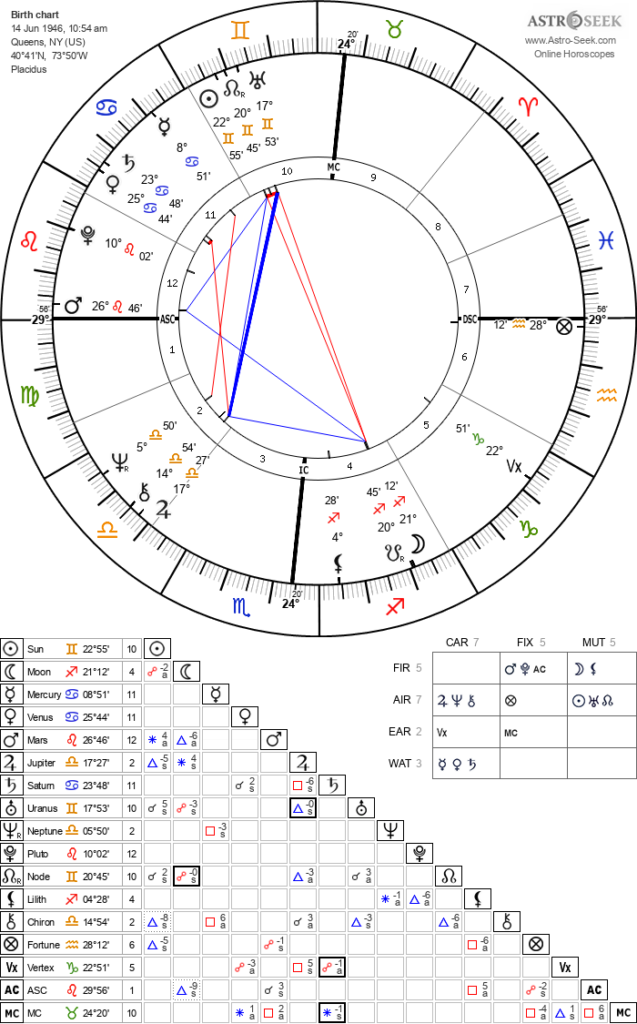 トランプ大統領の生年月日は、1946年6月14日で、ニューヨークのクイーンズで生まれ、出生時間は午前中10時54分とされています。以前の投稿でも出生図をみていますが、再度、ざっくりとみてみます。