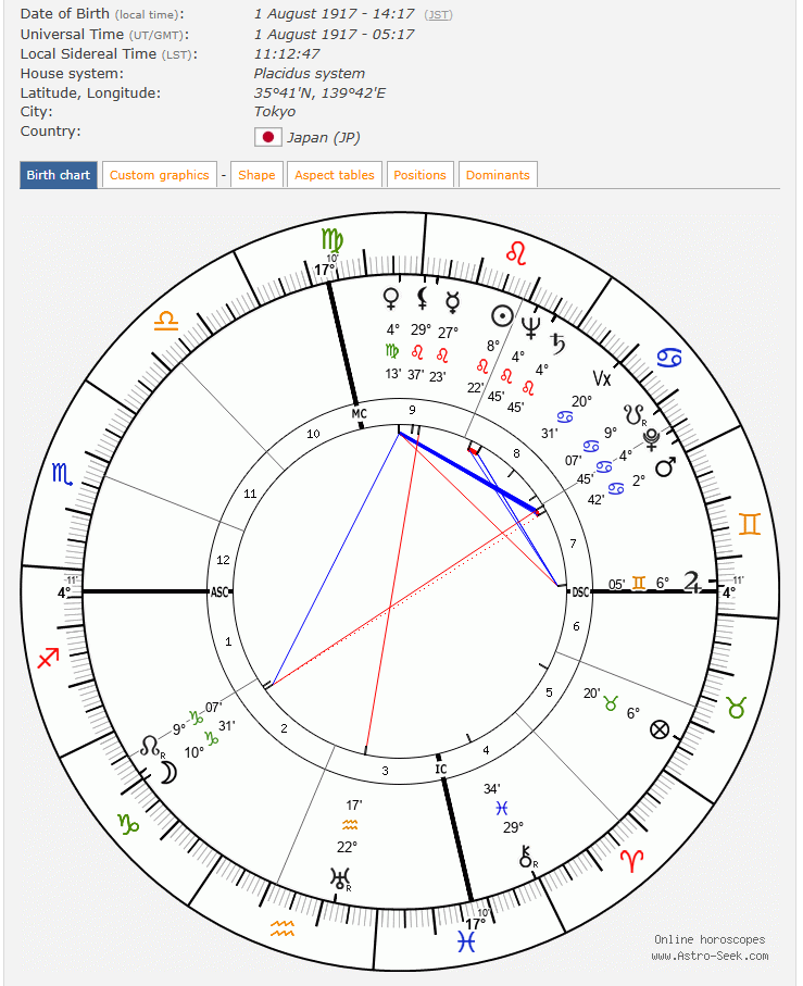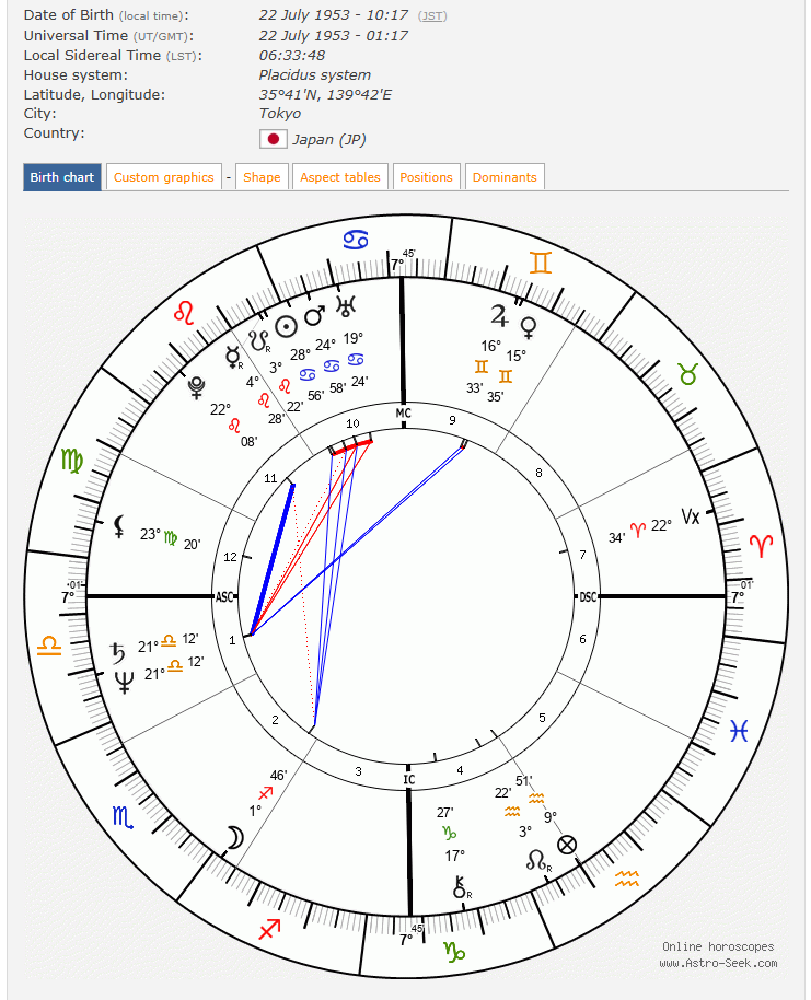 最後のタイミングである、1953年7月22日の星の配置をみます。正義、公平、バランスをあらわす風星座の天秤座の21度で、土星と海王星が重なっています。同じく風星座の双子座にいる、木星と金星からの援護もあり、とても風の要素が強い配置になっています。