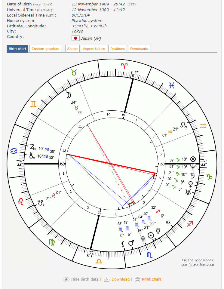 一方をあらわす木星は反対側の蟹座にいて、山羊座にいる天体に対して、対立する様相をみせています。蟹座の木星は、日本という国の豊かさを象徴するので、かなり矛盾した配置にみえますが、実際には1989年の資産バブルは、単純に日本国内の豊かさをもたらすものではなかったということが、示唆されています。